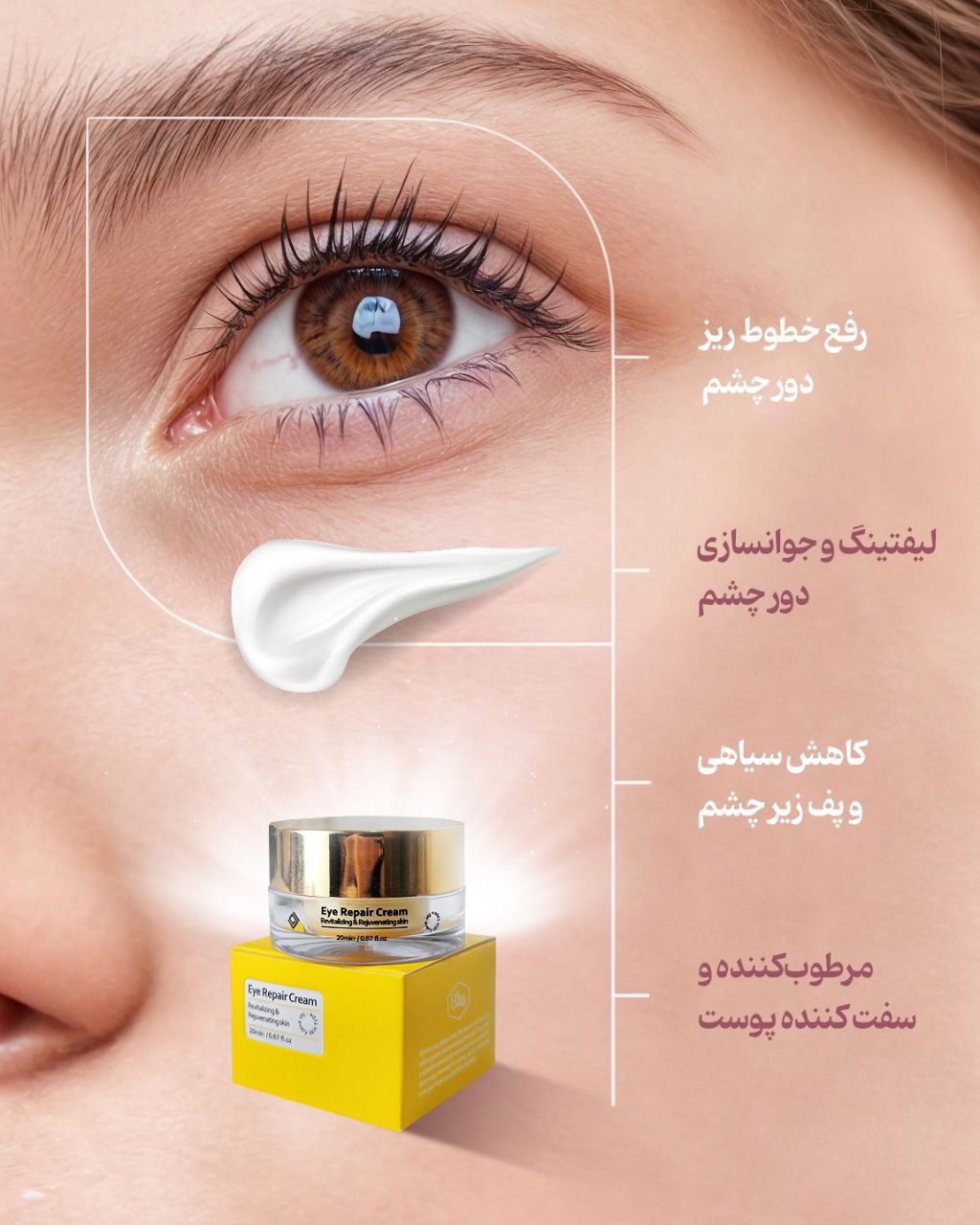 لطفا ناحیه اطراف چشم را با پاک کننده مخصوص و پد کتانی تمیز کنید . سپس ، هر روز صبح و شب مقدار مناسبی از کرم را روی پوست اطراف چشم بزنید و به آرامی با نوک انگشتان ماساژ دهید تا کاملا جذب شود .