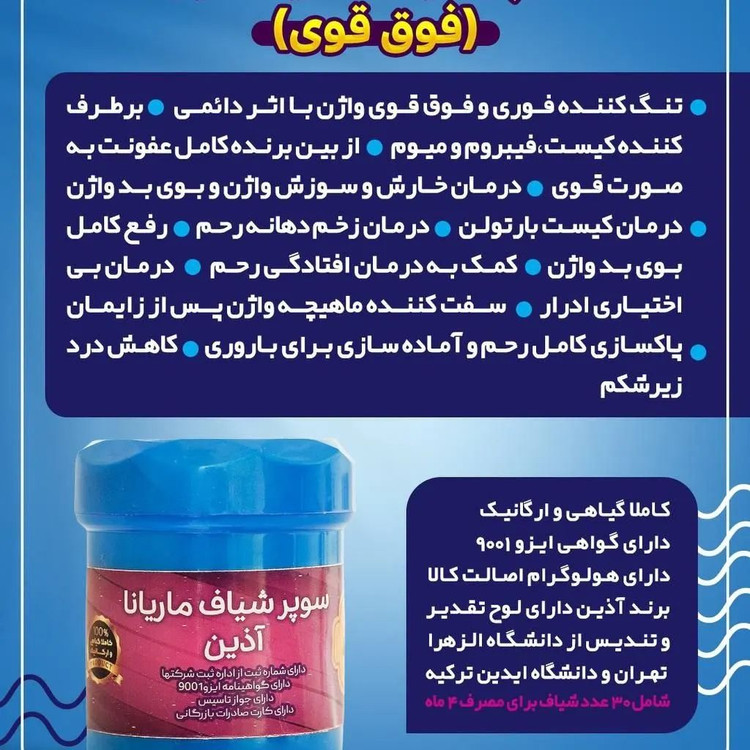 سوپر شیاف ماریانا آذین (فوق قوی) تنگ کننده فوری و فوق قوی واژن با اثر دائمی برطرف کننده کیست،فیبروم و میوم از بین برنده کامل عفونت قارچی ،باکتریایی و عفونت های کهنه رحم به صورت قوی درمان خارش و سوزش واژن درمان کیست بارتولن درمان زخم دهانه رحم رفع کامل بوی بد واژن دفع اضافات باقی مانده از سقط جنین کمک به درمان افتادگی رحم درمان بی اختیاری ادرار سفت کننده ماهیچه واژن پس از زایمان پاکسازی کامل رحم و آماده سازی برای باروری برطرف کننده ضخامت رحم کاهش درد زیر شکم با استفاده از این شیاف واژن تا یک سال تنگ میماند اثر تنگ کنندگی این شیاف به صورتی است که یک عدد از این شیاف برای یک هفته تا ده روز اثر دارد اما برای درمان در یک دوره هفته ای دو بار باید استفاده کنید ، بعد از پایان دوره تا یکسال واژن تنگ باقی میماند دوره درمان در ۸۰ درصد موارد ۱ دوره ترکیبات سیاهدانه ،عسل کوهی ،مازو و. شامل ۳۰ عدد شیاف برای مصرف ه کاملا گیاهی و ارگانیک دارای کارت صادرات بازرگانی دارای گواهی ایزو ۹۰۰۱ دارای هولوگرام اصالت کالا دارای لوح تقدیر و تندیس از همایش بین المللی صدا و سیما و دانشگاه الزهرا و دانشگاه آیدین استانبول